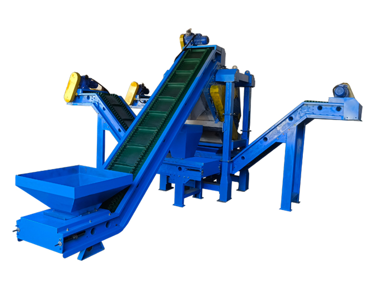 該設(shè)備5+2組合式磁選機(jī)由1臺入料輸送機(jī)、3臺出料輸送機(jī)和一臺磁選機(jī)構(gòu)成,物料經(jīng)上料輸送機(jī)輸送進(jìn)入磁選機(jī)主機(jī),均勻地先后分布到兩個(gè)永磁滾筒,首先確保了非磁性材料的干凈度,其次吸過的磁性材料純度不高會(huì)夾雜非磁性材料與一些中間產(chǎn)物(含鐵的非磁性材料——黏連體)再經(jīng)過五次中磁滾筒提純,在五次提純過程中有一部分夾雜過來的非磁性材料依次回落到非磁性區(qū)域。三臺出料輸送機(jī)分別為純鐵料出口,非磁性材料(鋁、銅、鋅等)出口和中間料出口。