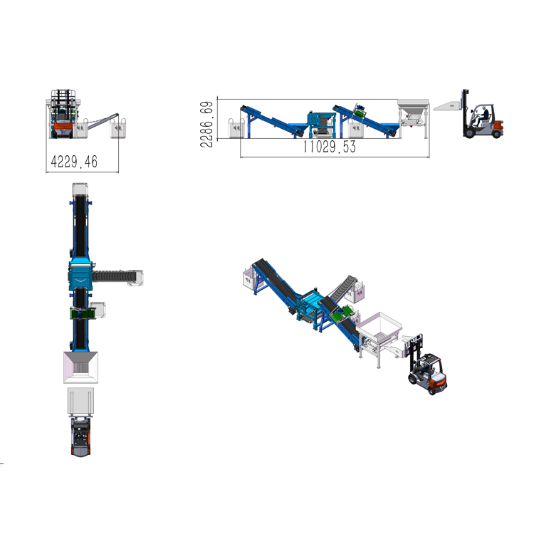 叉車鏟斗(傾翻叉或半自動叉車自翻斗)給料到大料倉后,下面是一個雙振動電機給料器,均勻給料到皮帶輸送機,輸送機末端吊掛懸掛自卸除鐵器,把大塊鐵吸走,落入噸袋,再落入振動給料器,進行強磁分選,鐵和不上磁的物料分別由兩條輸送機打入到噸袋。