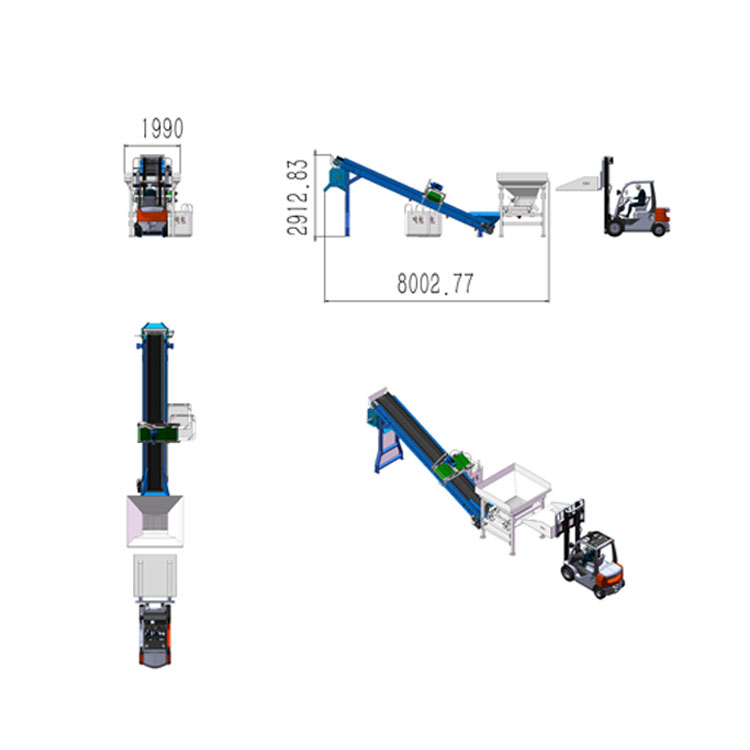 叉車鏟斗(傾翻叉或半自動叉車自翻斗)給料到大料倉后,下面是一個雙振動電機(jī)給料器,均勻給料到皮帶輸送機(jī),輸送機(jī)末端吊掛懸掛自卸除鐵器,把大塊鐵吸走,落入噸袋,小塊物料可通過吊掛半磁磁選機(jī)吸到兩側(cè),實(shí)現(xiàn)鐵與其他物料的分離。