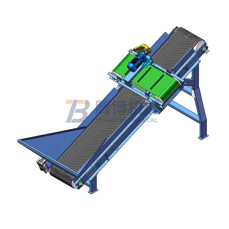 皮帶輸送機(jī)+自卸式除鐵機(jī)的工作原理是經(jīng)過皮帶輸送機(jī)入料,上磁的鐵經(jīng)過自卸式除鐵機(jī)被吸附在皮帶上,皮帶轉(zhuǎn)動帶動磁性物料,經(jīng)過無磁區(qū)域,磁性材料自動脫落。